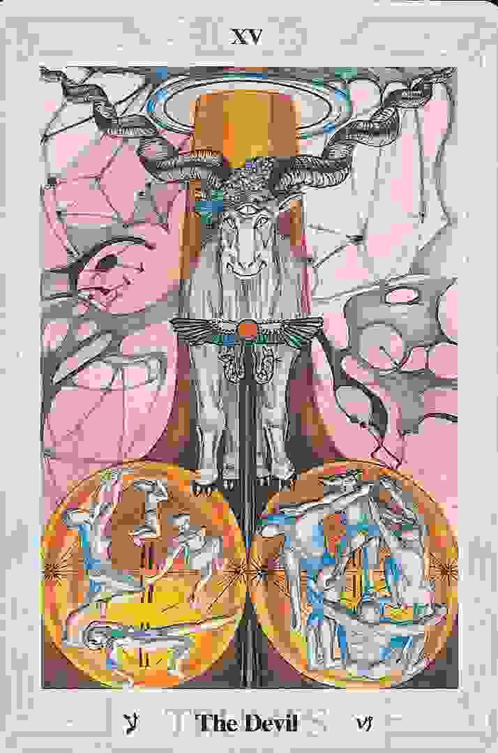 However, in the imagery of the RWS Devil card there are interesting comparisons to the Thoth Tarot as well. This image also shows the Goat of Capricorn, the wings of Chaos, and the Hebrew letter Ain. There are reasons for the lack of "others" in the RWS-Devil image. That is because this card emphasizes that the querent is being seduced by the material world. Fear of rejection, and need of physical pleasures that binds a personality that is suffering from NPD. This card implies that we are our own "devil". Even our relationships are based on exploitation of sexual counterparts through emotional manipulation, a personality product of the Patriarchy.